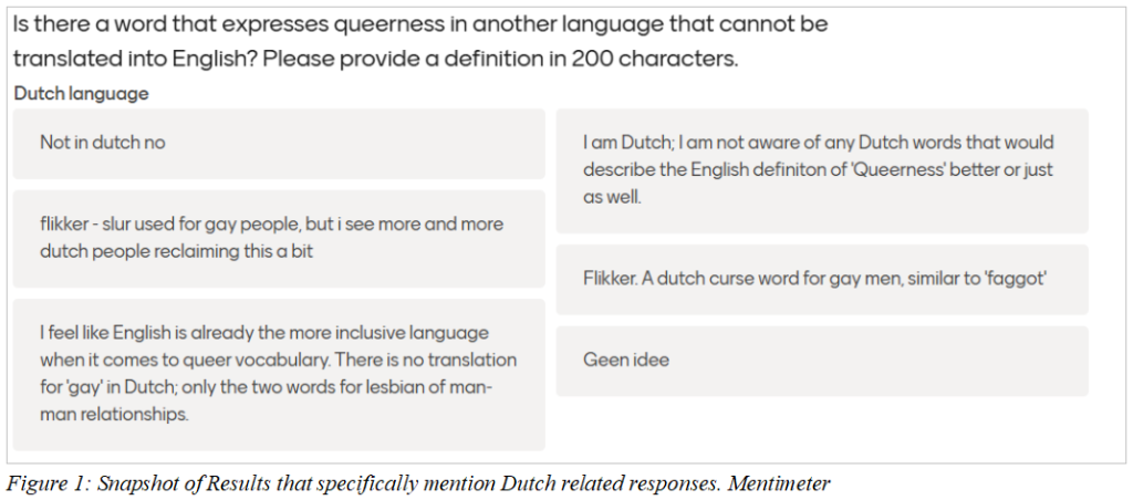 As the Queer Linguistic Festival neared its conclusion, one final Dutch respondent added a new dimension to the discussion in the last round of the survey. ‘I find it, generally speaking, annoying that we have a lot of English words in everyday Dutch conversation. We have the word homo and that is a perfect translation of gay, so why don’t we use it?’