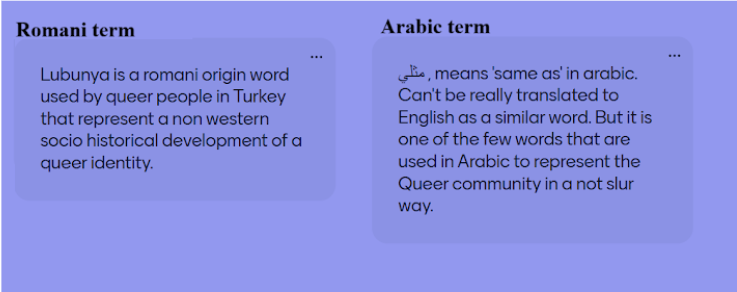 Another example mentioned in our results is the Arabic term يلثم (mithli), meaning “same as me”, and representing effort to create a positive label for queer Arab identities. The term emerged as a translation of the English word homosexual and was promoted by Arab queer activists as a politically correct alternative to the derogatory shādh (Mourad, 2013). However, mithli is sometimes contested within local communities. Unlike its derogatory counterpart, which carries stigma and can be reclaimed, mithli attempts only to neutralize negative associations, but despite its politically correctness, it still appears in formal media linked to negative portrayals of queer life (Jaber, 2018). According to Jaber (2018), the term offers a neutral label but fails to capture the everyday experiences of Arab queer lives. It is also important to notice how in the case of the Arab communities, activists and scholars highlight the difficulty of expressing queer identity in Arabic without always reproducing stigma and moral judgement, leading queer people to either use Western terms such as gay or lesbian, which are disconnected from their own cultural context, or be forced to use terms that feel either inadequate or obsolete. Arab queer activists are currently facing the challenge of “queering the mothertongue”, trying to balance linguistic accessibility with cultural authenticity (Mourad, 2013). A positive initiative in this direction is the Queer Arab Dictionary (Strange Horizons, n.d.), which documents queer terms in Arabic, providing context for their use, and making the vocabulary accessible to both queer communities and allies.