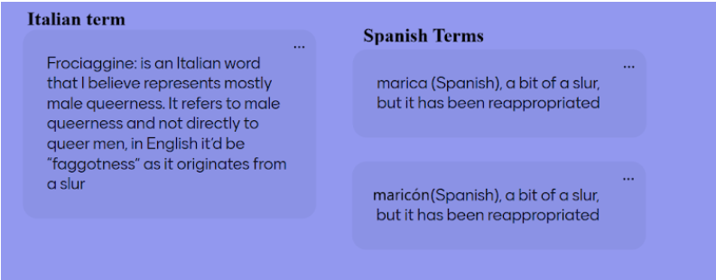 As part of our pilot study, participants were asked to identify words in their languages that express queerness but cannot be directly translated into English. Interestingly, most responses were slurs, reappropriated terms, or newly coined words aimed at shaping positive queer identity. This highlights the importance of language as a tool of empowerment and resistance to marginalization.